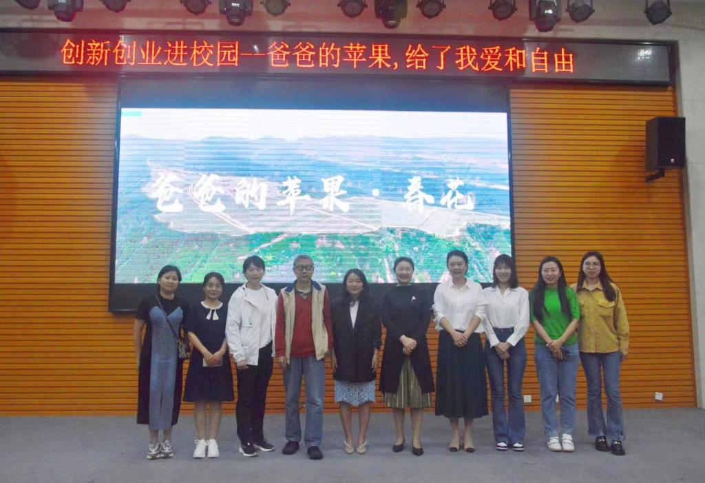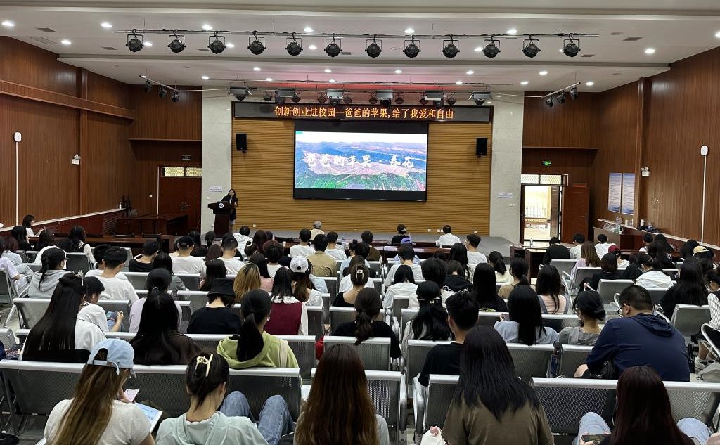刘阿娟向学弟学妹们分享着她一路走来的奋斗故事,尽情地释放着“野心”的激昂,一路前行成功为淳化县完成2.5% 的脱贫指标,为338户贫困户成功摘帽。首先,刘阿娟讲述了她创业的原因,因为父亲的患病、家庭的重担,让刘阿娟不得不放弃了大城市的发展机会,返回到家乡淳化县。从一开始看到九顷塬的水源严重不足到开始规划修筑水利工程引水;从走在崎岖不堪的山坡到为村镇修出整齐的道路。在刘阿娟的努力下,“爸爸的苹果”项目现如今已成为数亿级别的量级,成功成立创业实践基地,九顷塬基地也被评为市级示范园。刘阿娟表示,“好学力行,自强不息”的校训指引自己敢于拼搏、勇于实践,她也鼓励同学们毕业后积极投身到社会建设中,将个人的小爱分享给更多的人、洒向更广袤的土地,振兴乡村、生生不息。