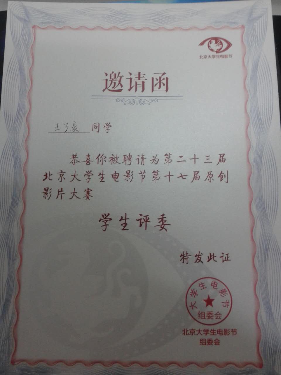 4月16日,我院新闻系14级王子豪同学受北京大学生电影节组委会邀请担任第二十三届北京大学生电影节第十七届大学生原创影片学生评委。此次评选汇聚了中国传媒大学、北京师范大学、北京电影学院、中央戏剧学院等全国高校的110名大学生。