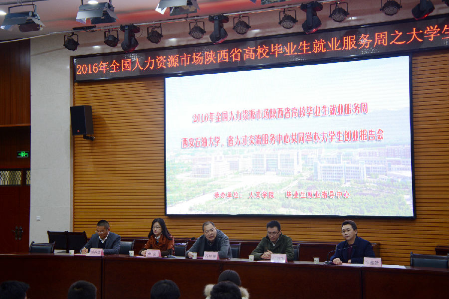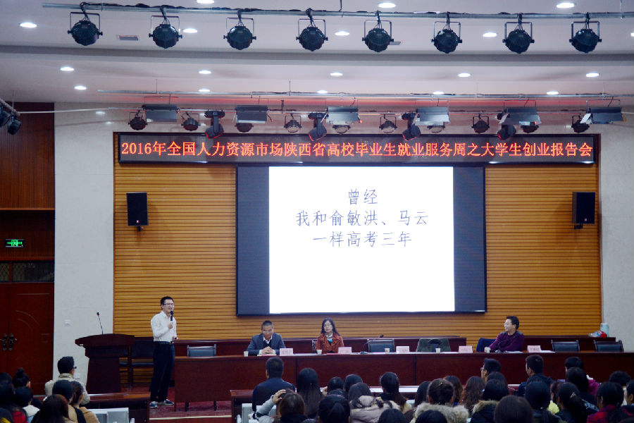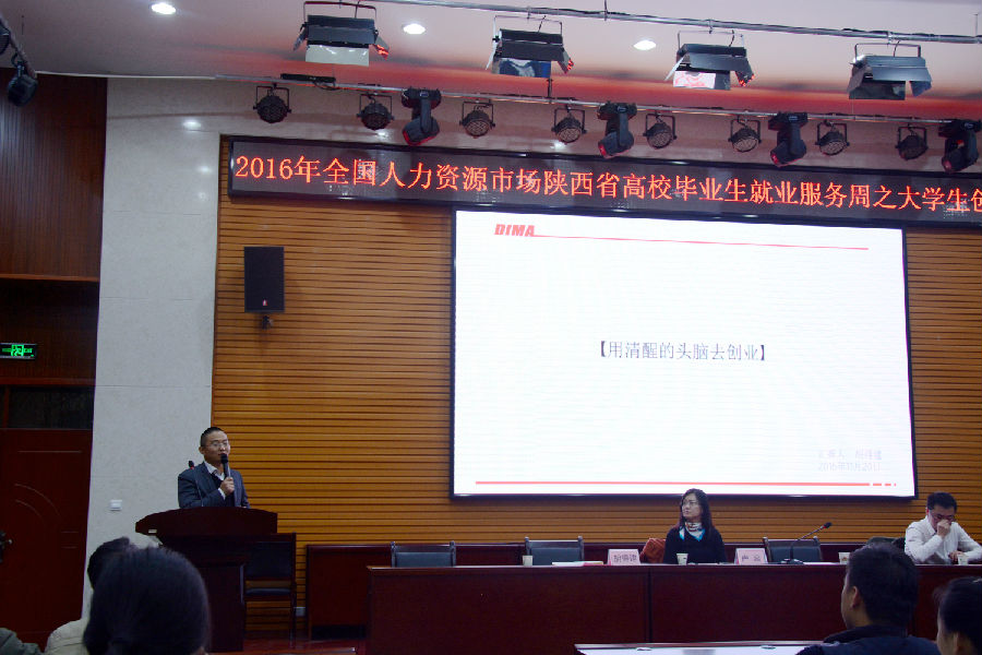 11月21日,2016年全国人力资源市场陕西省高校毕业生就业服务周之大学生创业报告会在我校新校区人文经管院楼(118)就业指导中心多功能报告厅举行。校学生处副处长、就业指导中心副主任齐仲锋,陕西省人才交流中心大学生创业工作部卢蕊,西安子牙企业管理咨询有限公司、西安勤人信息科技有限公司总经理何创飞,西安迪漫广告文化传播有限公司、西安迪漫品牌策划有限公司、西安迪漫信息科技有限公司总经理胡得建应邀出席。报告会由乐彩论坛