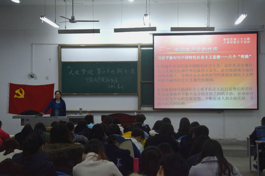 典礼过后,学院党委书记袁玎老师为大家讲授了第一课。课堂上,袁书记结合党的十九大报告,围绕习近平新时代中国特色社会主义思想图文并茂地为大家认真讲授了中国共产党的性质等内容。学员们听讲认真,学习氛围浓厚。纷纷表示:通过学习更清晰地了解了我党的光辉历史,进一步坚定了入党志愿。