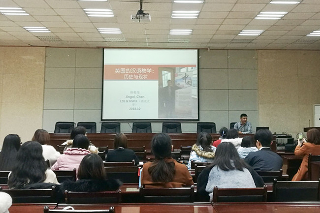 在西阶第三会议室举办了以“英国的汉语教学与商务汉语课程”为主题的人文学术沙龙。本次讲座由黄庆丰副院长主持,主讲人为西北大学汉语国际教育系主任陈敬玺副教授,部分教师及2018级汉语国际教育专业全体学生参加。