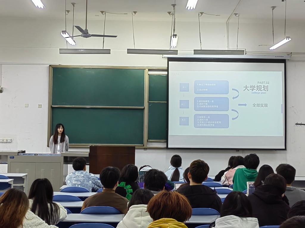 相凯馨同学从个人情况、大学规划、学习经验等方面与大家分享自己的经历。她鼓励同学们要多尝试,走出自己的舒适圈,开发自己的潜能,发现自己的闪光点。对于学习,要多阅读作品,将复习重点放在专业课的课本上,并从四六级方面分享自己对大家的建议,希望大家能够重视。对于大学竞赛,要多开展、精开展,从竞赛中不断提高自身的能力。