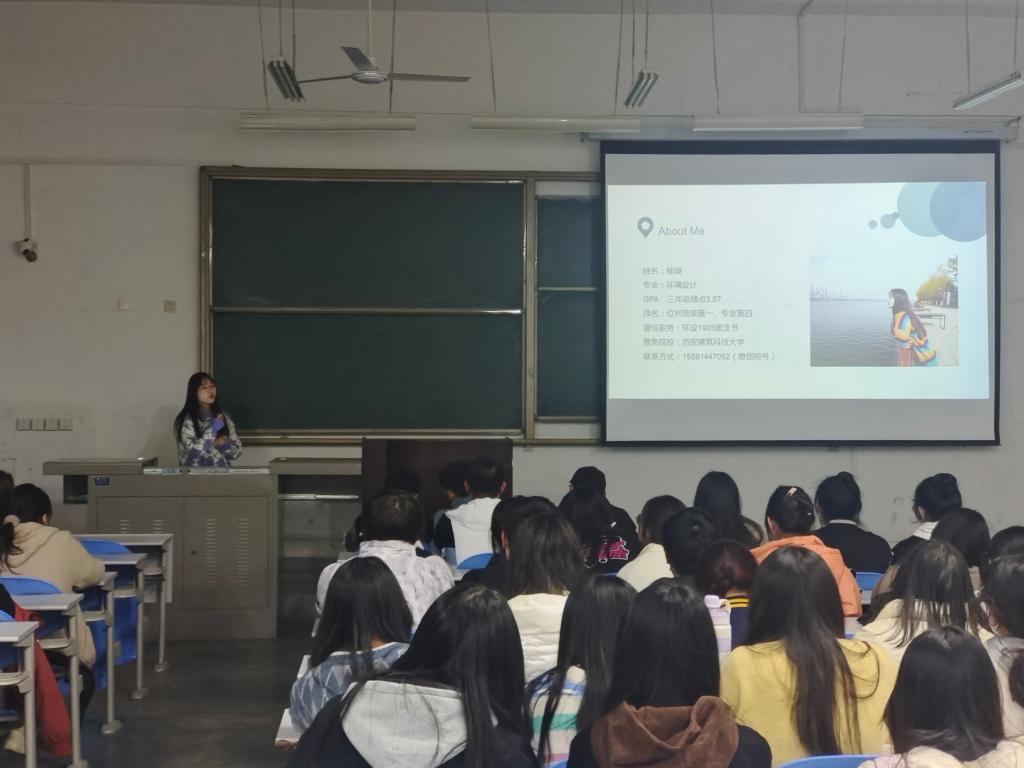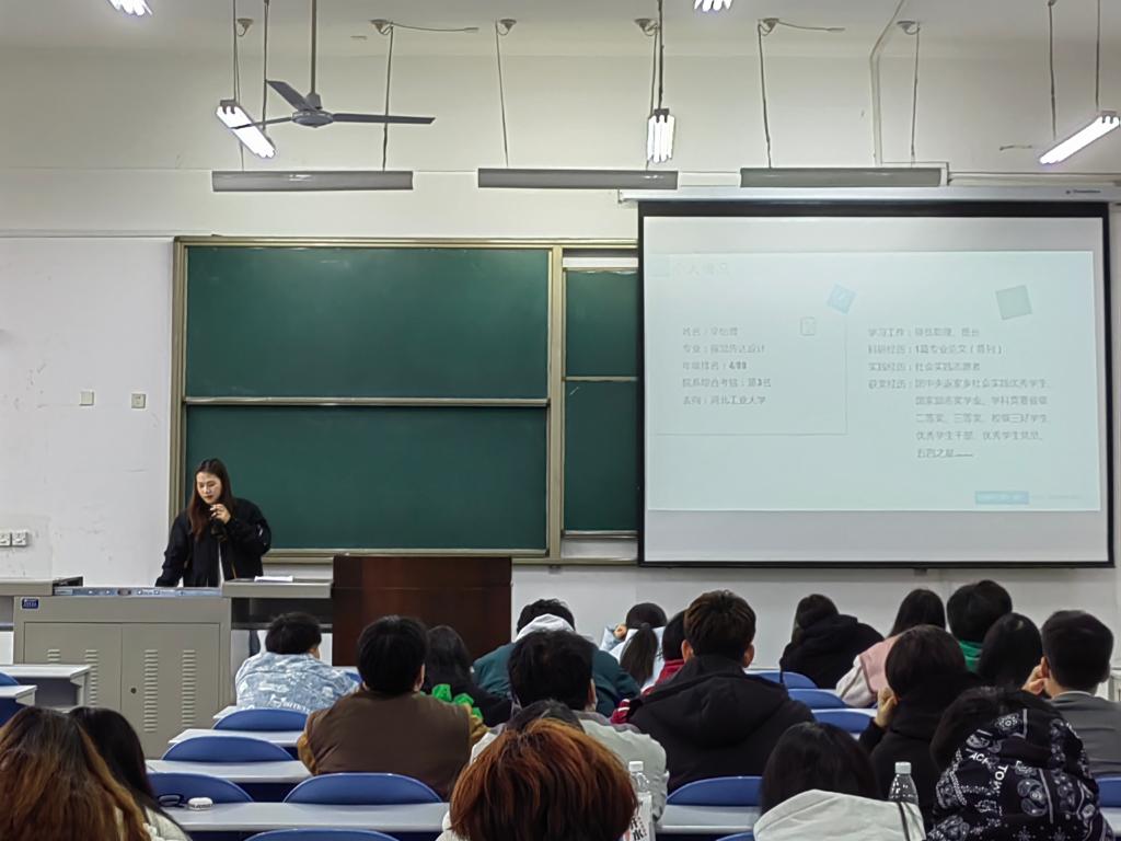辛怡萱同学向同学们详细讲解了保研推免的资格获取要求,以及多种保研方法,很详细地将准备资料、院校面试、确定录取各个时间段中的问题进行解释,期间不断回应同学们的疑惑。希望同学们懂得利用学校资源,从而弥补自己的不足。最后她特别强调了设计类专业英语四级的重要性,并将自己学习四级的应试技巧进行了分享。