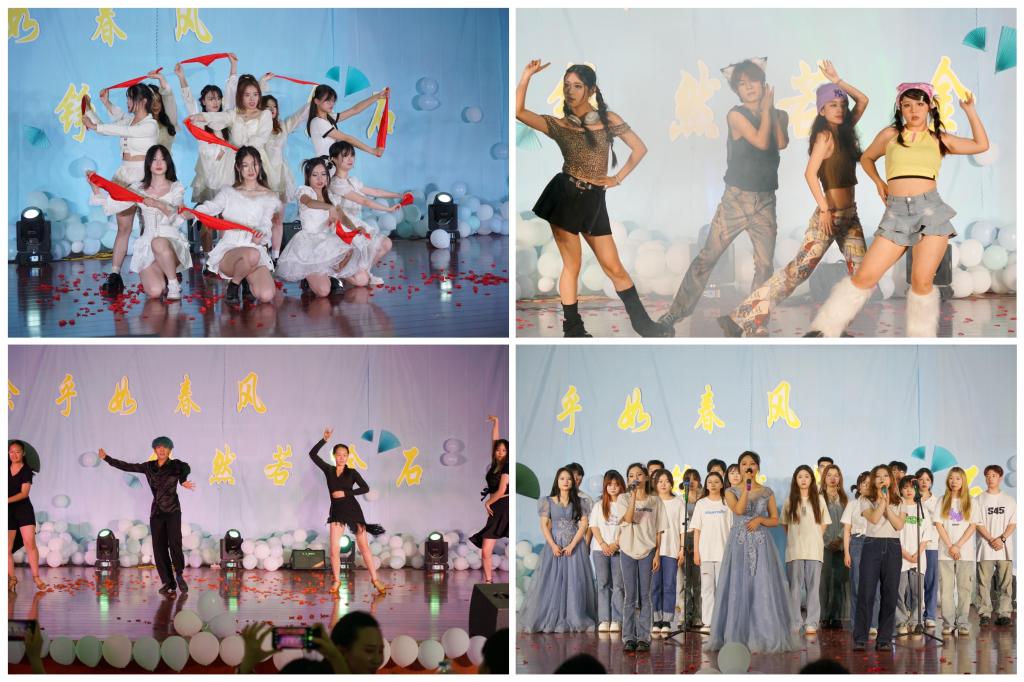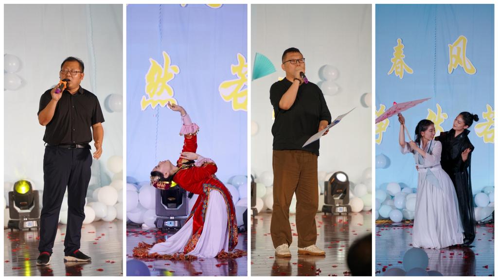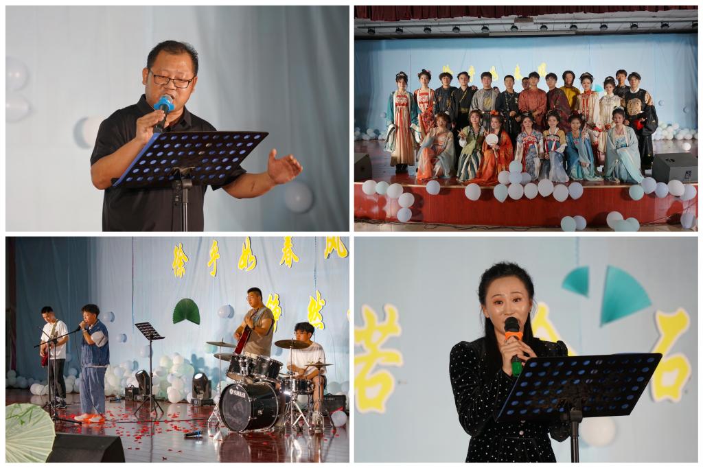 晚会在传统服饰T台秀中拉开序幕,模特们缓步徐行,雅而内敛,文而柔韧。一步一动,动摇清风,收放间尽显文人风骨,人文学子们用这种独特的方式展示自己对传统文化的认知和热爱;方松林副院长和新闻系邓笑然老师的诗文配乐朗诵《诗意中国》,激昂高亢与轻柔婉约并存,描绘着一幅国泰民安的景象;学生表演歌曲《千里之外》、《天若有情》、《不染》、《Love story》、《蓝莲花》,他们是舞台的中心,用优美的歌声让台下的观众感受到了青春的律动,展示了活力十足的青年模样;新闻系李臻老师与学生knock乐队共同演绎《你不要担心》、《推开世界的门》,歌声化作翅膀、唱响希望,期待我们奔赴下一场诗与远方;舞蹈《玫瑰人生》、《恰牛》、《晨曦中的玫瑰》、《Queencard》、《缘起》,在律动节奏中、在舞台灯光下,整齐划一的舞姿,恰到好处的卡点,一上场便引来阵阵惊呼,尖叫声和掌声不绝于耳,青春洋溢、激情四射,她们用舞姿展现自己的青春风采;中文系薛永刚老师的一首朗诵《再别康桥》,在轻悠的配乐中,用饱满的感情将听众带进诗中,在诗里感受徐志摩的眷恋之情,体会缠绵惜别的心情;方松林副院长带来的《同一首歌》、《再见》,优美的旋律、仿佛随着歌声飘荡进了我们的心灵深处,引起了观众们的共情,全场进行合唱;最后,学院学生会的学生干部将一首小合唱《记念》,送给即将告别的学长学姐们:虽然即将远航,我们依然不说再见,我们期待更好的明天。