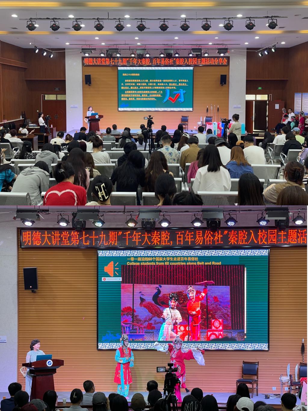 本次活动是全党深入开展学习贯彻习近平新时代中国特色社会主义思想主题教育之际,为贯彻“两个结合”的最新成果,落实高等教育“立德树人”根本任务开展的秦腔入校园传统文化主题活动。在讲座开始之前,易俗社秦腔演员们为现场师生呈现了秦腔音乐及优秀作品选唱,进行了良好的视听导入,激发同学们的兴趣与热情。惠敏莉社长首先分享了秦腔的历史渊源、声腔特点、版式、表演形式及行当等内容,易俗社演员们按照“生旦净丑”的角色分类上台表演,将秦腔行当直观得呈现出来。接下来,惠社长从易俗社成立与发展的革命背景、人物介绍、原创剧本、学员教育等方面展现了易俗社丰富的文化底蕴与历史内涵。通过对二十大报告内容的深入解读,阐明易俗社的发展前景,从校园活动、基层慰问、涉外交流等方面介绍易俗社秦腔艺术文化的传播实践,呼吁同学们积极参与传统文化的保护与传承工作。在分享会结束后,惠社长邀请同学们上台体验秦腔艺术,同学们积极参与互动体验秦腔服饰、道具、乐器等各个部分,进一步感受秦腔的文化魅力。