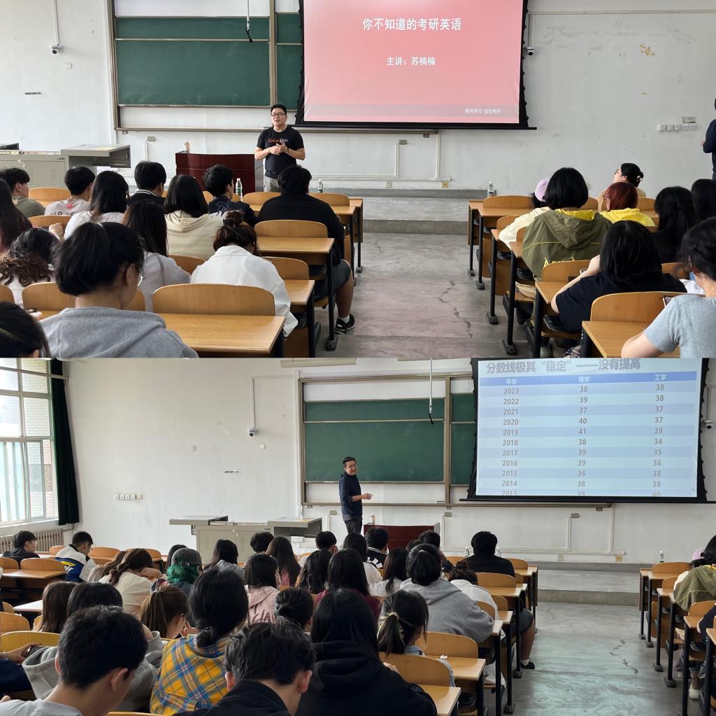 在博思楼321教室举办了2021级学生考研形势分析与规划指导专题报告会。报告会由考研讲师蔡乾锋与英语名师苏楠楠主讲,学工办主任付强、2021级辅导员张馨元及2021级全体拟考研学生参加本次讲座。