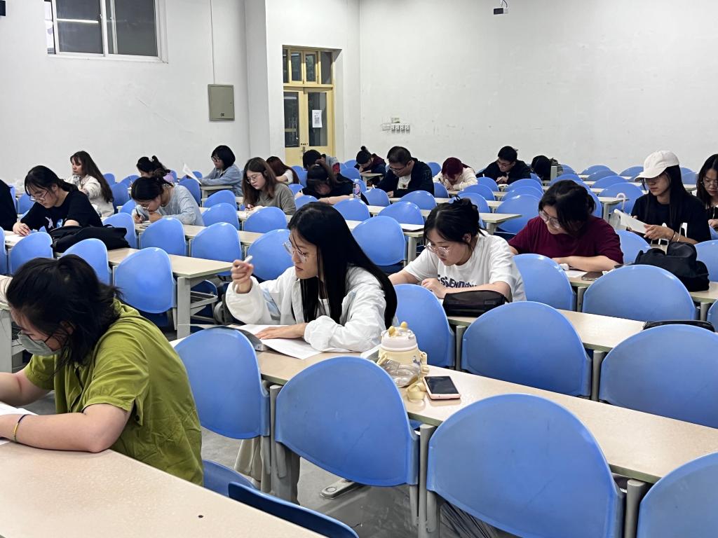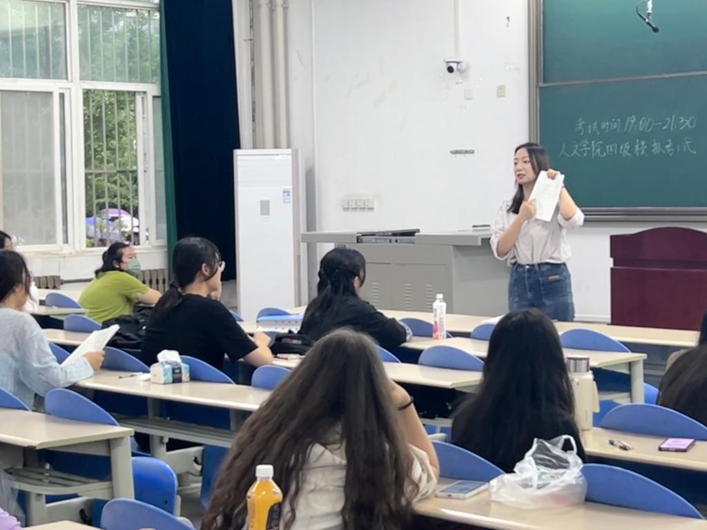 考试前,2022级辅导员范嘉欣强调了考试纪律问题,要求大家以积极认真的态度对待考试。本次四级模拟考试严格按照流程进行,提前入场、有序入座,考试期间同学们认真答题、沉着应对,监考人员认真负责,考场氛围严肃紧张。