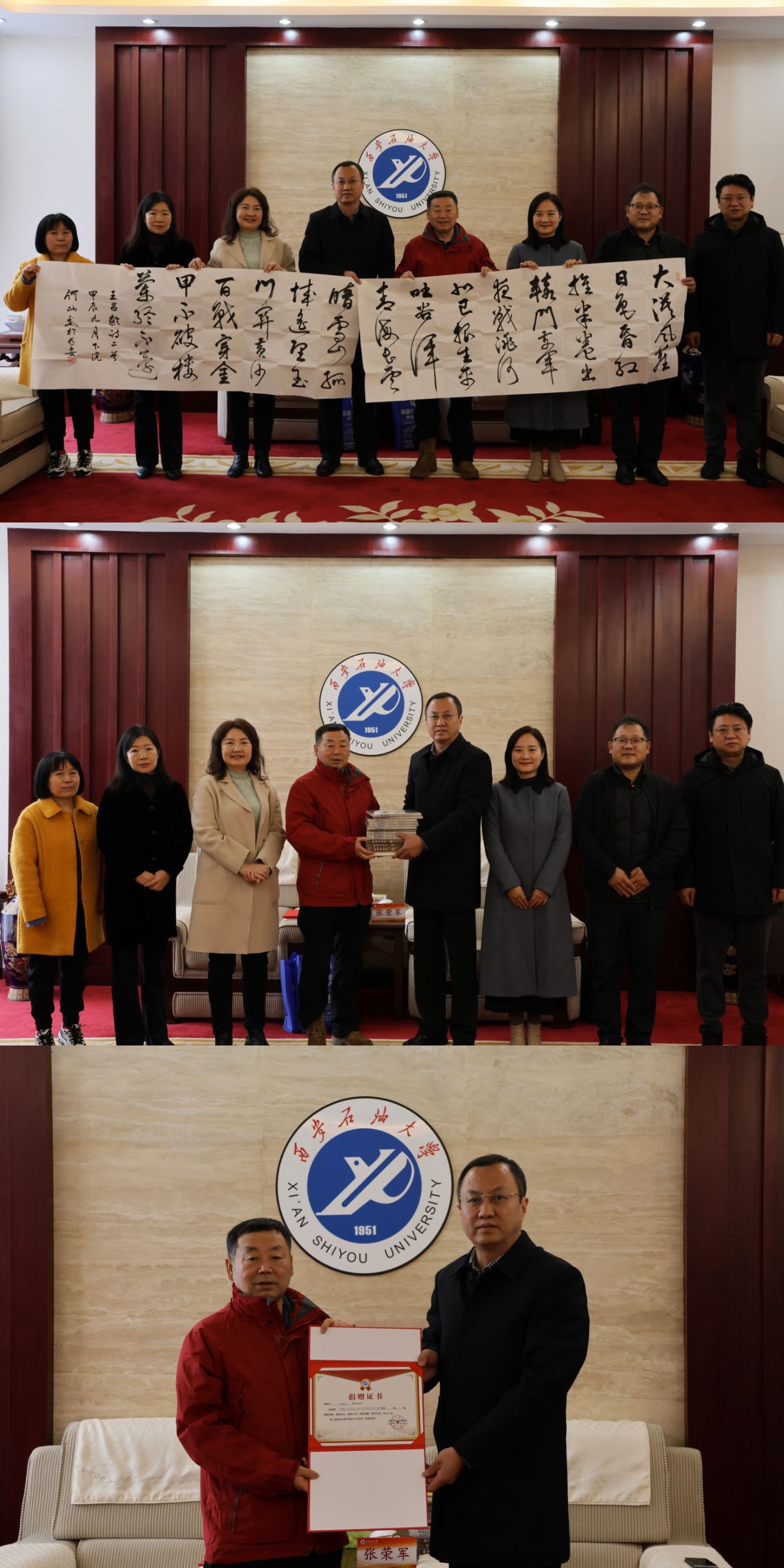 在捐赠仪式上,何炳武先生结合自身书法学习经历,就陕西省书法研究现状、中华文化传承与书法历史沿革等内容向与会领导进行了深入交流,详细介绍了书法与中国文化、中国书法精神、黄帝文化丛书等研究成果。深入交流后,何炳武先生向我校图书馆捐赠了王昌龄《从军行》诗两首书法作品、《中国书法思想史》、《陕西书法史(上中下)》等16部专著。