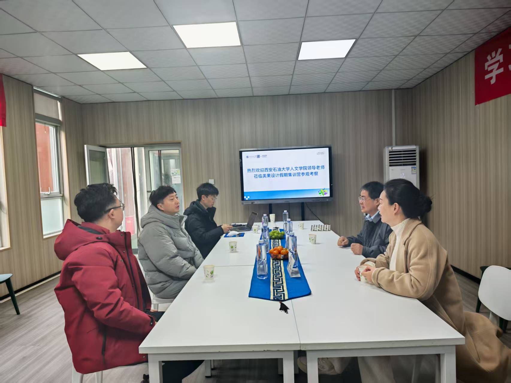 首先,由美果设计市场经理、我院2018级校友赖崧详细介绍了校企合作项目的进展情况,包括专题讲座、学科竞赛、专场招聘等多个方面,并分享了集训营学员在百度、快手、蔚来、阳狮等大厂实习情况和个人作品集。随后,双方就人才培养、就业推荐等方面进行了深入交流,美果设计创始人耿金强调了与高校合作的重要性,并表示始终对学员实行严格的管理政策,涵盖用水用电安全、住宿安全以及心理健康等方面。余小勇对美果设计在学院就业工作方面的大力支持表示感谢,明确表示学院将一如既往的支持校企合作,并建议双方可以在课堂教学、教师交流、就业指导等方面进一步深化合作。盛丹表示,学院将积极探索校企合作新领域,加强校友与在校生之间的联系,让校友的成功经验成为在校生宝贵的学习资源。