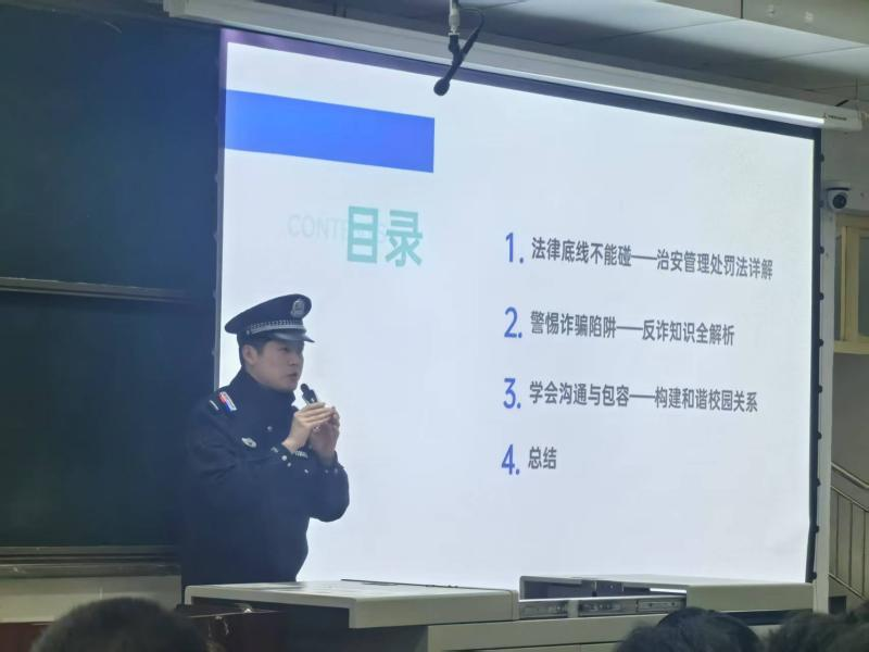 安全教育讲座从以下三个方面展开:法律底线不能碰——治安管理处罚详解,在这方面,潘佳乐带领同学们重点学习了违法与犯罪的区别,通过真实发生的案例向同学们介绍了校园常见的违法行为,涉及校园暴力、言语侵权、传播不良内容、盗窃等几个方面,深入浅出,引人深思。接下来是本次安全讲座的重头戏:警惕诈骗陷阱——反诈知识全解析。首先,潘佳乐讲解了诈骗的定义与常见误区,自然引出了对诈骗套路的揭秘,接着向同学们传授了众多反诈骗措施,总结起来就是:切勿听信、沉着冷静,迅速报警。最后一方面:学会沟通与包容——构建和谐校园关系,他鼓励同学们在遇到自身无法解决的问题时,学会求助老师,求助学校,求助警察,卸下心中沉重负担,拥抱精彩人生。