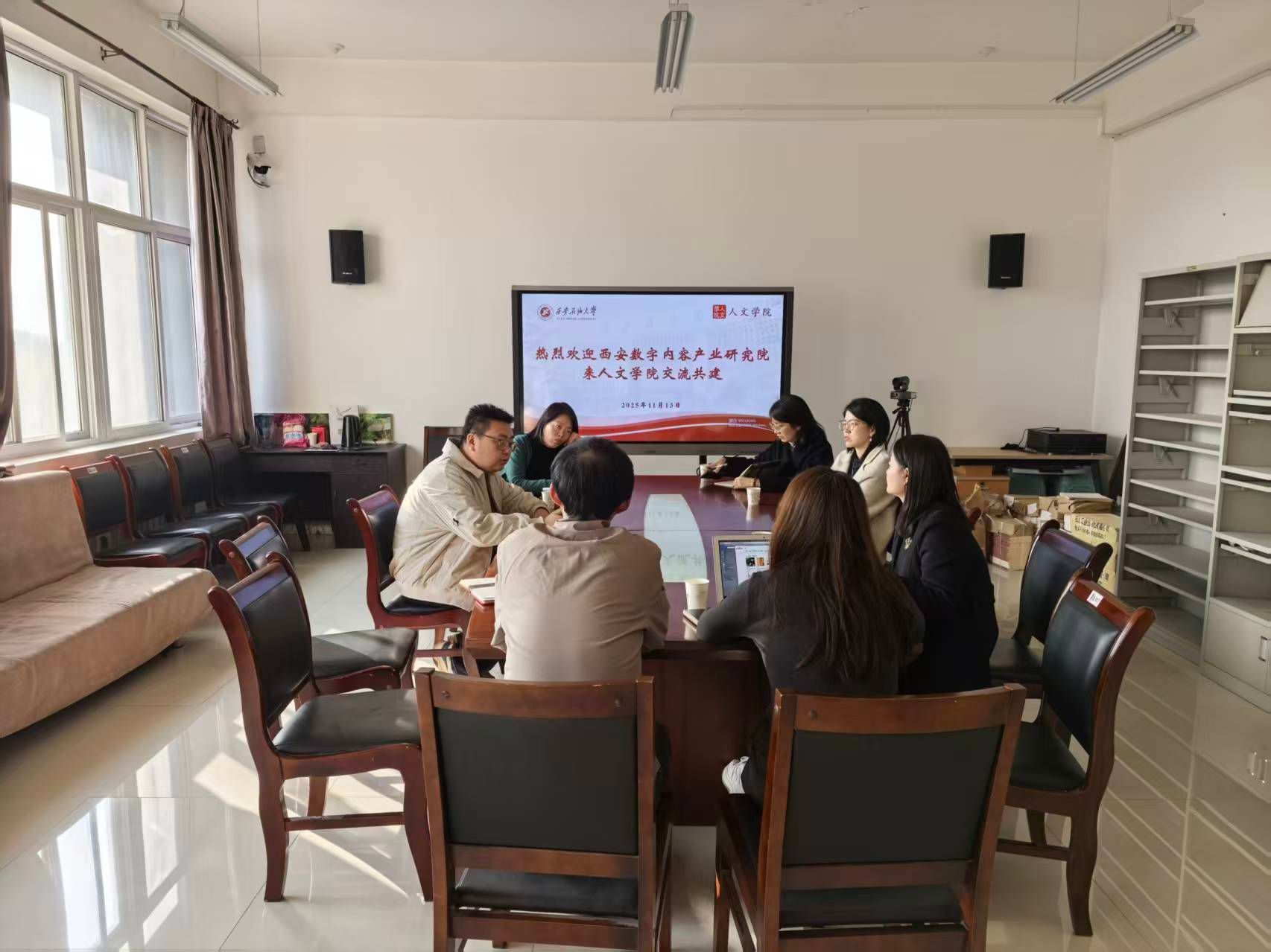 院长方亭、中文系主任王敬艳、新闻系主任马可、设计系副主任王宁鑫及何奇颖、新闻系教师吴晓辉、学生办公室副主任范嘉欣等学院领导与教师代表,与西安数字内容产业研究院代表进行了深入交流。