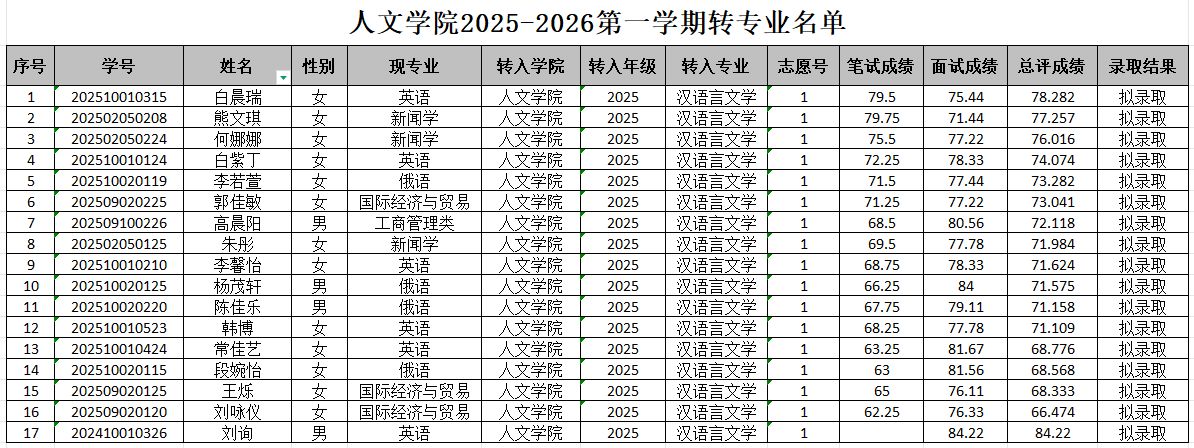 根据《西安石油大学全日制本科生转专业转学管理办法》《西安石油大学关于做好2025-2026学年第一学期本科生转专业工作的通知》及《乐彩论坛 本科生转专业实施细则》等相关通知及要求,经本人申请、笔面试考核,乐彩论坛 本科生转专业工作领导小组审议通过,现将乐彩论坛 拟录取名单公示如下: