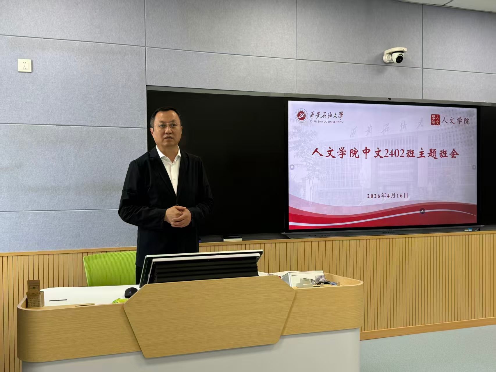 4月16日下午,副校长张荣军、中文2402班班主任在鄠邑校区博览楼A201教室召开“回望耕耘路,笃行向未来”主题班会,学工办副主任范嘉欣、2024级辅导员樊煜及中文2402班全体同学参加本次班会。