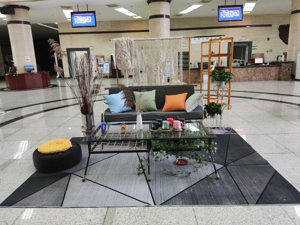 沙发采用废弃单人床架和废弃栏杆作为底座和靠背,用黑色哑光漆喷涂金属架,再用定做的灰色沙发垫和充满活力的彩色靠枕做装饰,展现出简约现代的整体风格。茶几主体由废弃金属拼接而成,桌面采用定做的长方形玻璃,用编织绳和花篮做点缀,绿色环保,清新自然。桌子上摆设的西安石油大学七十周年校庆杯子与主题相呼应。单人座椅由黑色轮胎制成,编织绳填充轮胎空心部分,加上黄色坐垫点缀。花篮、金属花筒均由废品改造而成,充分体现“废物利用,变废为宝”的设计理念。